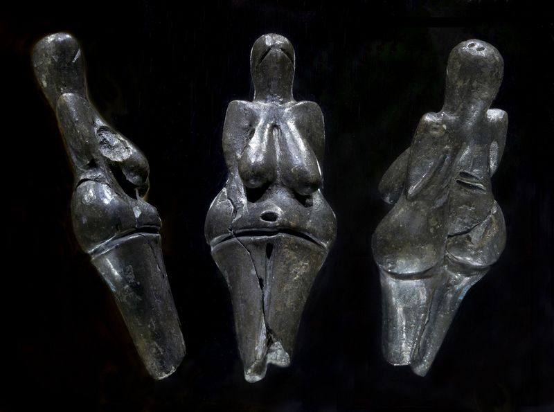 Despite the various proportions having changeable dimensions, the impression and message conveyed by these figurines clearly suggest they were created according to the same canon, established on a similar philosophical foundation of Palaeolithic society: the whole figure is worked into a lozenge shape, the upper point of which symbolizes the head, the lower point the feet, and the lateral tips touch the sides of the body; the circle inscribed into the central span of the rhombus delineates the maternal stomach; from the upper edge of the circle are suspended large breasts, while the lower part of the circle is made up of the genitalia. Thus it seems that Upper Palaeolithic artists were portraying a naked woman in the very late stages of pregnancy. Additionally, in the profile of the rhombus we can see the ancient sign of the vulva, so that the figure not only symbolized, but in a ritual could also positively affect, the childbearing and reproductive power of a woman, from which emerged all members of the group and in which they recognized the embodiment of the sexual principle, ensuring the continuation of life.