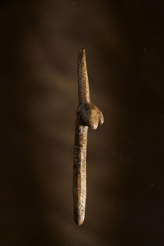 Stick decorated with linear incisions to create a stylized female figure with strongly accentuated breasts. By changing our viewing angle we can see that the symbol also encodes the male principle – the female figure transforms into a symbol of male genitalia. The upper part of the stick has been reconstructed, and may originally have contained an eyelet for suspending it.