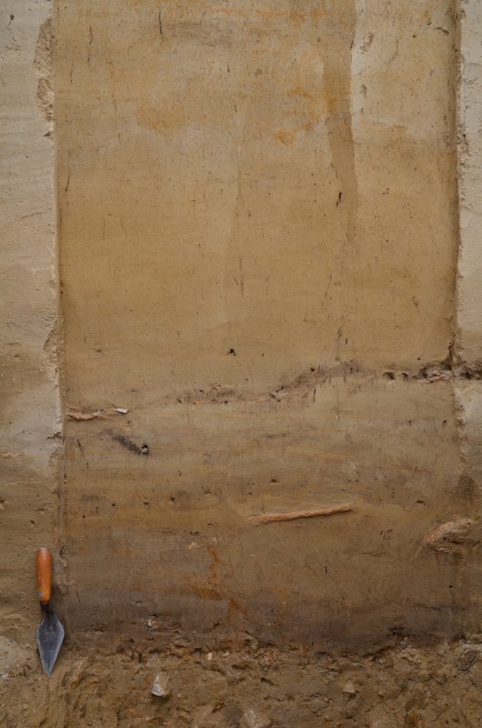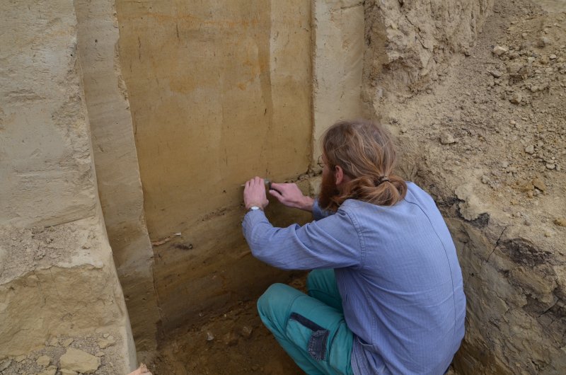 The upper part of the profile consists of the fine-grained light and chalky loess of the Last Glacial Maximum (last ice age), with a varied geochemical composition and structure, containing calcareous concretions and bands of precipitated iron, which have been partially deformed through frost processes. At its base we find the archaeological layers of the Gravettian with places containing charcoal, bones and artefacts, creating here a relatively compact, dark layer of varying thickness. Samples taken of the carbonized wood date the layer to the period of 25-30,000 years BP, which corresponds to the Middle and Lower Gravettian.In the subsoil of the loess has developed a more or less continuous brownish grey interpleniglacial soil with charcoal, beneath which runs a band of heavy, sharp-edged detritus composed of Jurassic limestone. The lower part of the profile is made up of a rich layer of Neogene clay sediments, in places mixed with limestone detritus and additionally affected by cryogenic deformation.