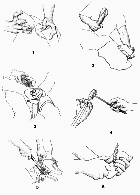 To strike off a flake or blade and also for making other modifications, either a hammerstone could be used (hard hammer), or an antler or bone tool (soft hammer). A core residue could also be used as a hammerstone.