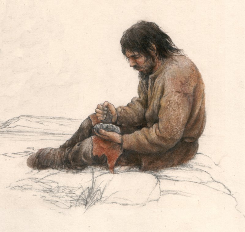 By chipping off surface flakes, the raw material was fashioned into the shape of a core, from which in the next phase were removed regularly shaped flakes or blades. In the Upper Palaeolithic, these came in a variety of sizes and were typically square-like or pyramidal in shape, with a characteristic leading edge. As the core was worked, its size was gradually reduced until it was entirely exhausted – the only remnants being core residues and various microcores.