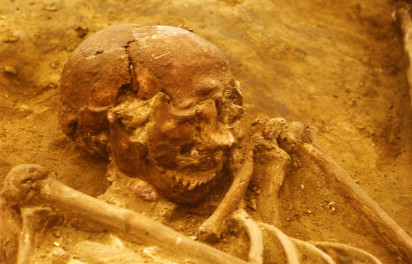 The man on the left (DV 13) has his hands placed upon the pelvis of the central figure (DV 15) and it appears as if  pouring red ochre pigment into his lap. The man on the right (DV 14) is lying face-down. The positioning of the bodies is deliberate and their gestures may be descriptive or symbolic. Both the outer individuals are strong and healthy young men. The middle figure at the centre of the tableau had a more graceful body, one however marked by a disease which must have been manifest in his appearance and behaviour. He is suggestive of a sexually indeterminate person, a “liminal individual”, such as those enjoying special attention in fourth world cultures and who carry out religious or healing practices.