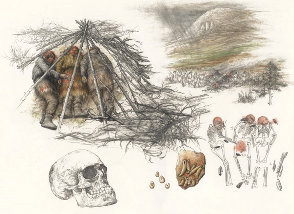 The skeletons were laid out horizontally, in a slightly excavated grave “bed”. The three skulls and the pelvis of the central individual are covered in pigment. Around the grave are concentrated traces of fire and whole pieces of spruce roundwood, indicating that the bodies may have been protected from the elements and against predators by a wooden structure.
