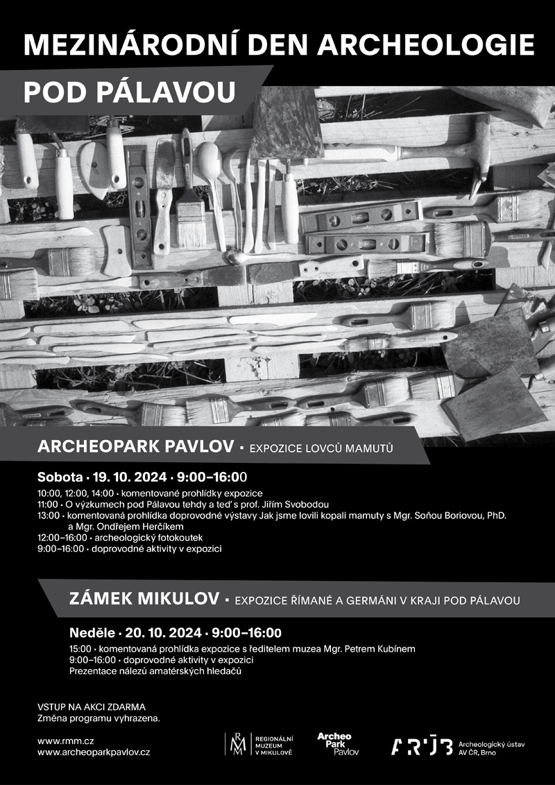 V sobotu 19. 10. 2024 se od 9:00 do 16:00 otevřou brány všem milovníkům archeologie zcela zdarma. Připraveny jsou tři komentované prohlídky stálou expozicí v časech 10:00, 12:00 a 14:00. Vyprávění “O výzkumech pod Pálavou tehdy a teď s prof. Jiřím Svobodou” (Archeologický ústav Akademie věd ČR, Brno) se bude konat od 11:00. Ve 13:00 proběhne komentovaná prohlídka s autory doprovodné výstavy Jak jsme lovili kopali mamuty Mgr. Soňou Boriovou, Ph. D. a Mgr. Ondřejem Herčíkem (Archeologický ústav Akademie věd, Brno).
