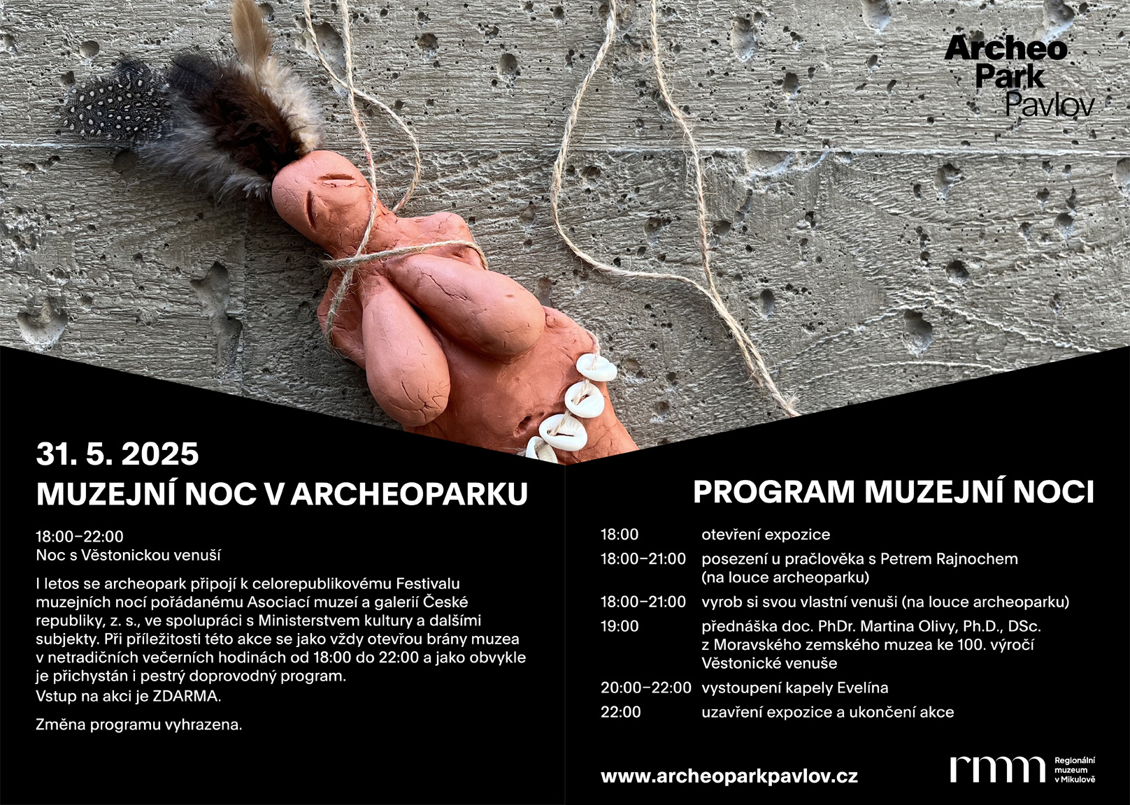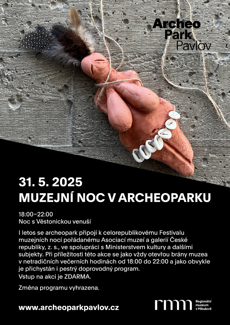 I letos se Archeopark Pavlov připojí k celorepublikovému Festivalu muzejních nocí pořádanému Asociací muzeí a galerií České republiky, z. s., ve spolupráci s Ministerstvem kultury a dalšími subjekty. Při příležitosti této akce se jako vždy otevřou brány archeoparku v netradičních večerních hodinách od 18:00 do 22:00 a jako obvykle je přichystán i pestrý doprovodný program, tentokrát v duchu oslav 100. výročí Věstonické venuše. Těšíme se na vás!